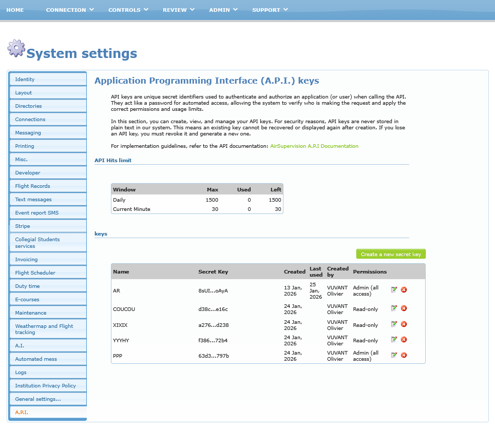 The API uses bearer tokens for authentication. Create and manage API keys in your system’s admin tooling. You’ll need Administrator credentials to access the settings menu.