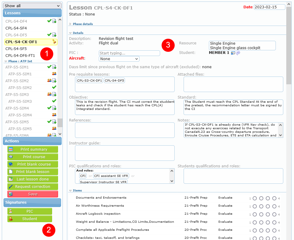 Whether to consult or to record an activity, this is the place of all course’s lesson details. Depending on user’s credentials, the system might limit access to some functionalities or information.