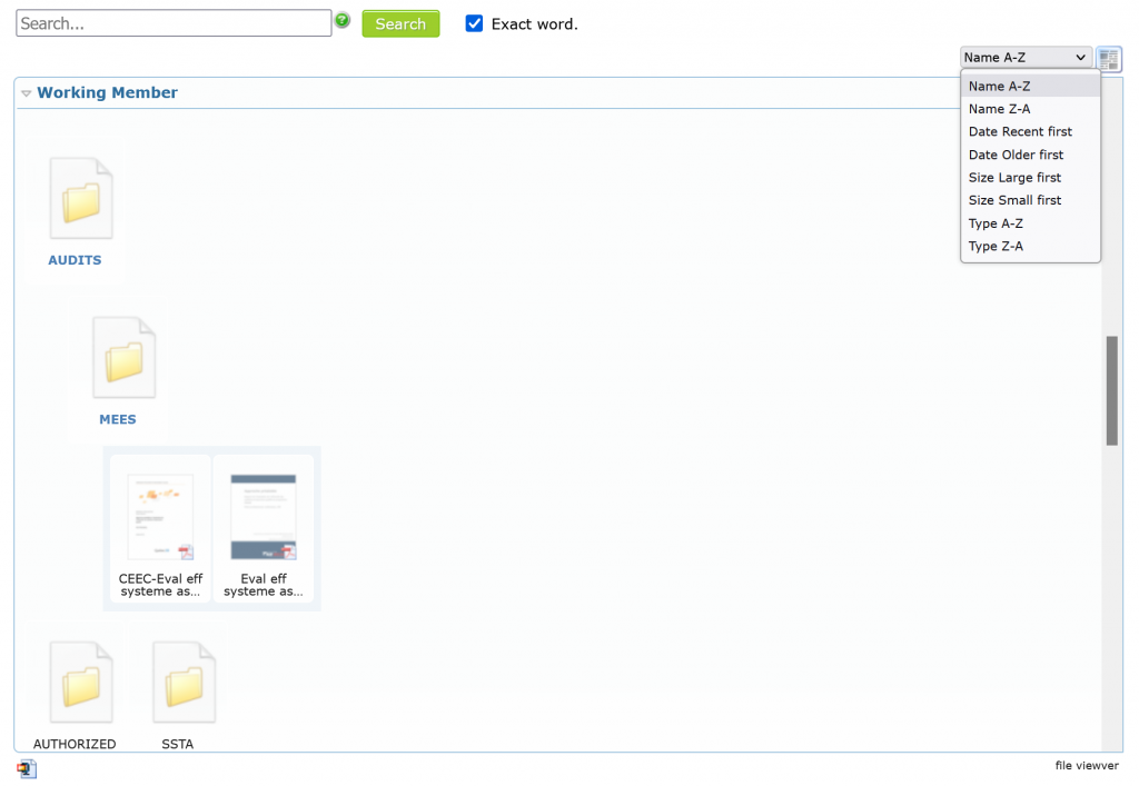 Files are generally displayed as shown above, as thumbnails, sometimes grouped or not. On the top right corner, just before the files displayed box, user can set the view order as follow: