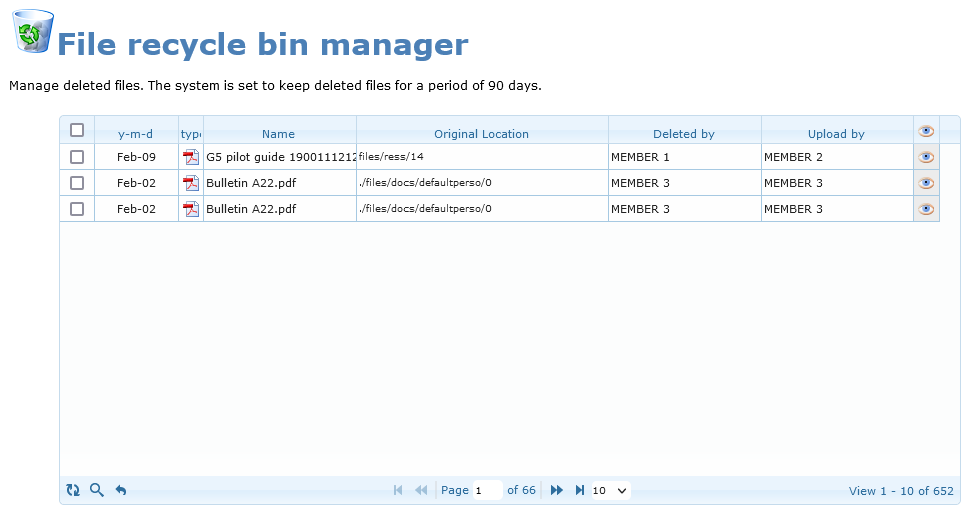 Access to the “Recycle bin”, where all deleted files are backup, is granted to all administrators if the portal option has been activated.