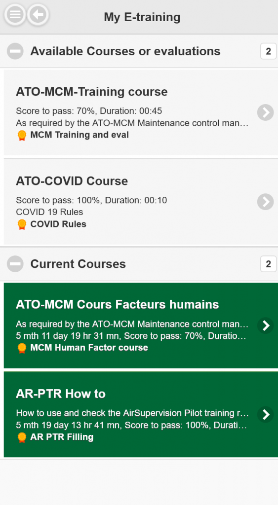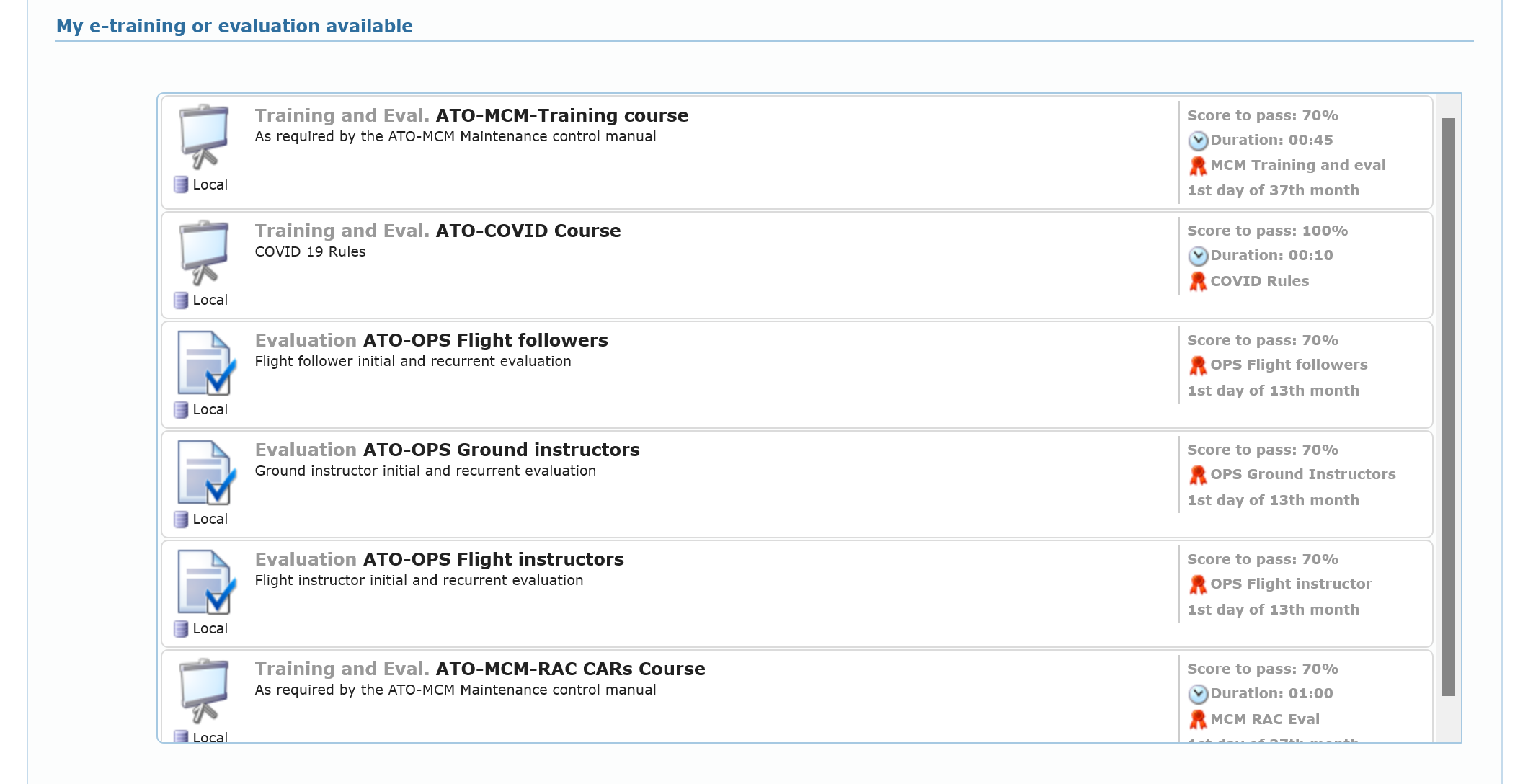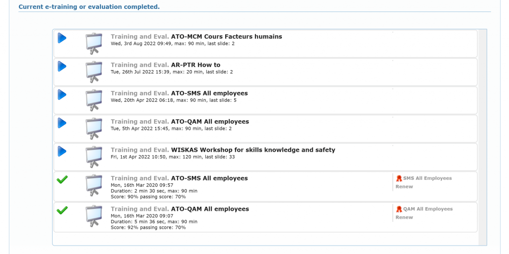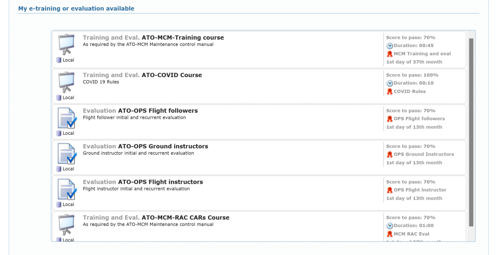 E-trainings are courses or assessment than can validate one competency specified by the organization. They shall be available depending on the member’s roles. There are two type of e-trainings:
