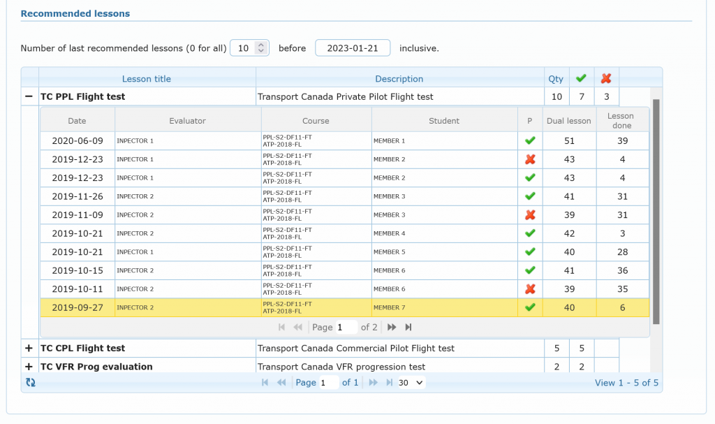 The below grid display all type of lesson recommendations for which the member was the main pilot, e.g the evaluator. Grid is detailed as follow: