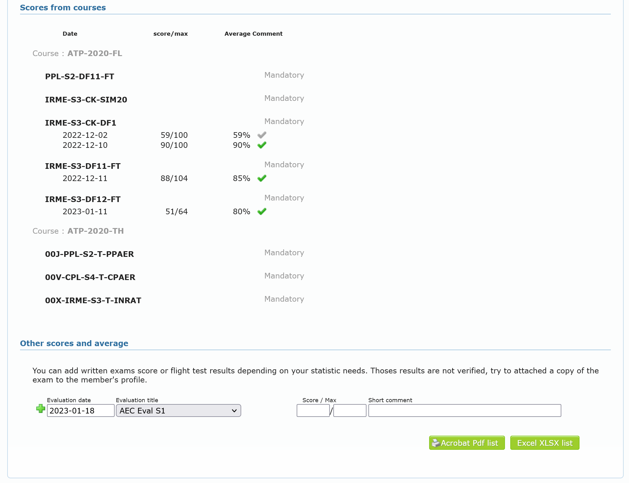 If set while designing course lessons, the main pilot can assess the overall lesson with a score. These lessons are listed as follow: