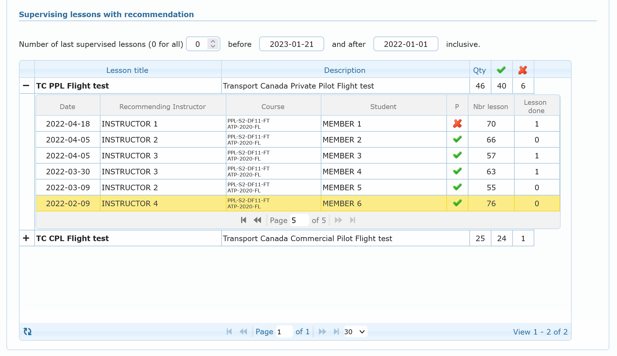 The below grid display all type of lesson recommendations for which the member was the main pilot, e.g the evaluator. Grid is detailed as follow: