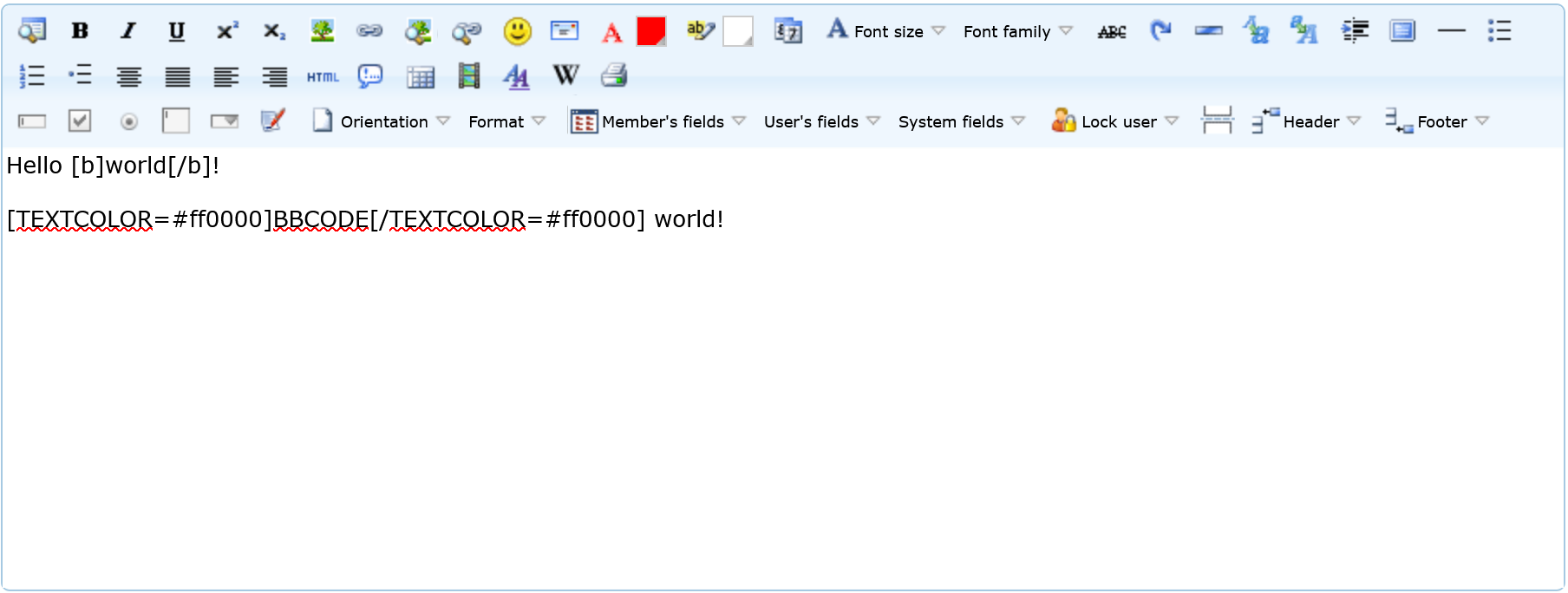 When available, the system offers the ability to add BBCode or dynamic fields to extend input functions. Easily recognizable by an added menu on top of the text area.