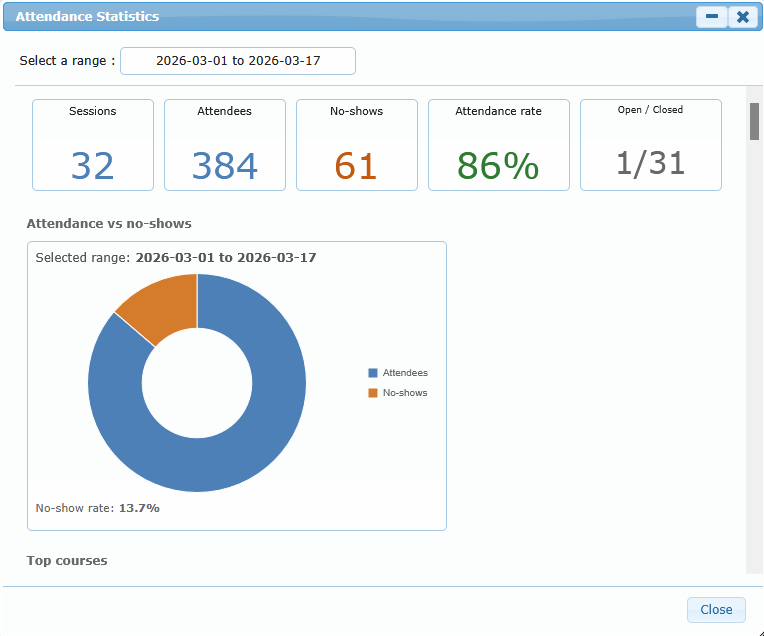 The Attendance Statistics view gives administrators a management summary of attendance activity over a selected date range. It is designed for trend review, instructor follow-up, no-show monitoring, and closure-quality checks.
