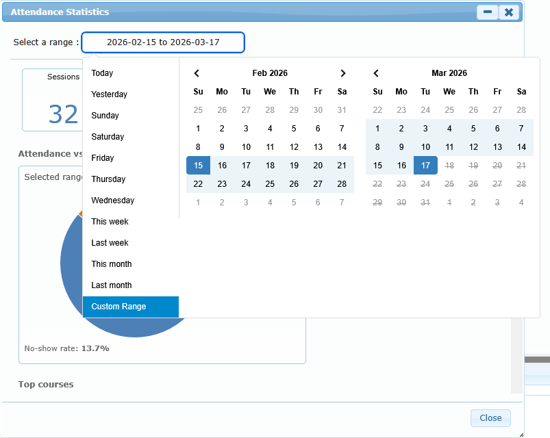 - The date range works independently from the Attendance grid filters. It is a separate analytics window.