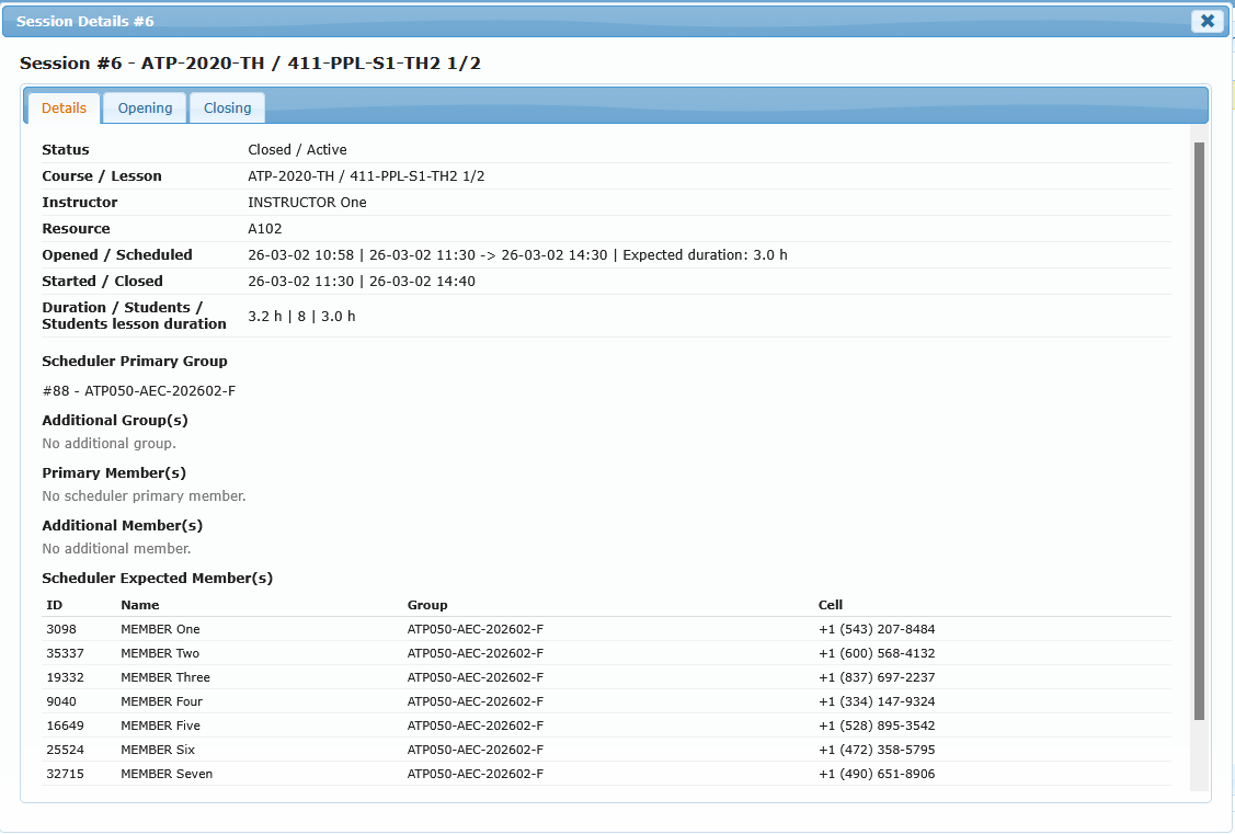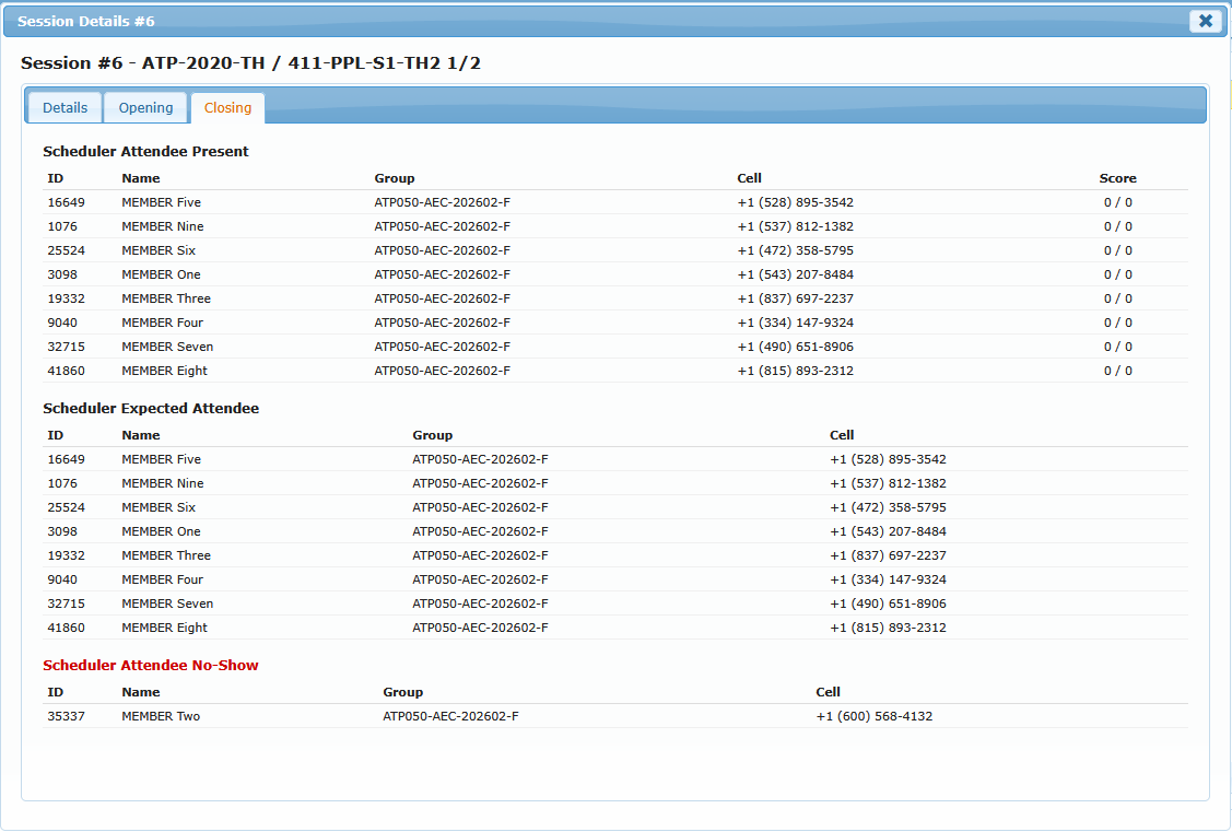 Use Session Details to review one session in depth, including schedule composition, attendance capture, and closing results.