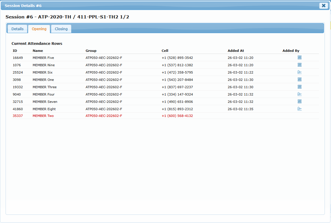 • QR icon: attendance row was added by unique QR identification scan.