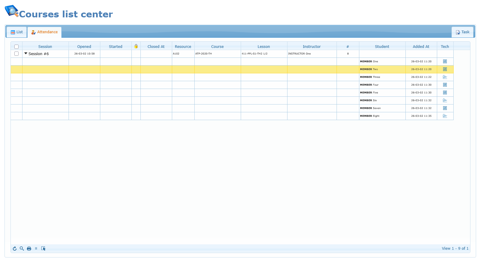 - Signature/select icon: attendance added via selection/sign flow.
