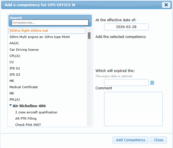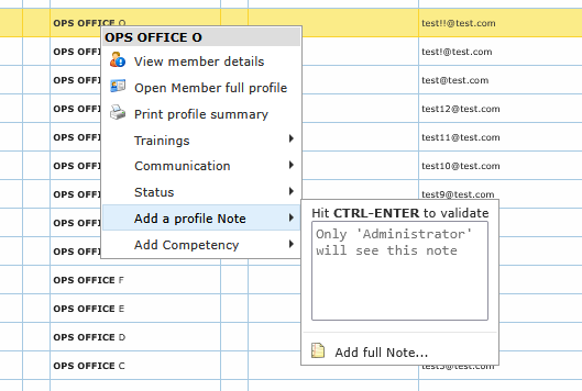 You can create a quick note directly from the menu or open the full note editor. You can also add competencies from context shortcuts.