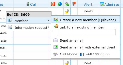 This is only available if activated in the portal options. The contextual menu of rows, of information or admission requests, will let the user “Create a new member” using the “Quick Add” feature. Some informations will be automatically transcribed in the dialog box such as name, address, email, phone or cellular numbers. The transferred email will be set as the primary email of the new member.