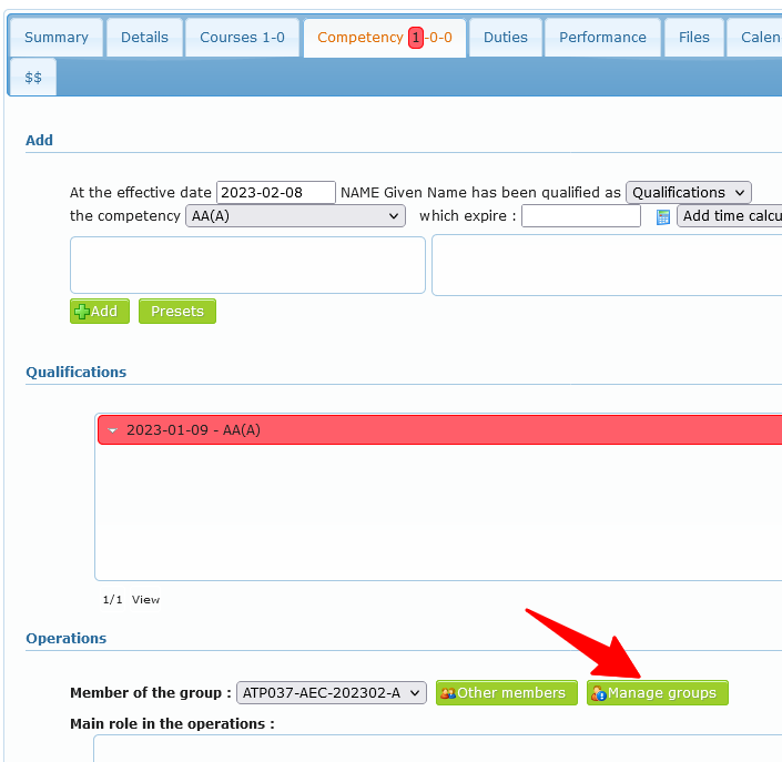 If proper credential is set for the user, in each member’s profile competencies tab, it is possible to manage list of groups.
